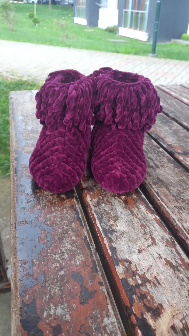 Mor örgü kız çocuk terlikleri, yumuşak ve sıcak dokusuyla bohem tarz sunar. Bilekte püsküllü detay bulunur. Evde rahat kullanım için uygundur.