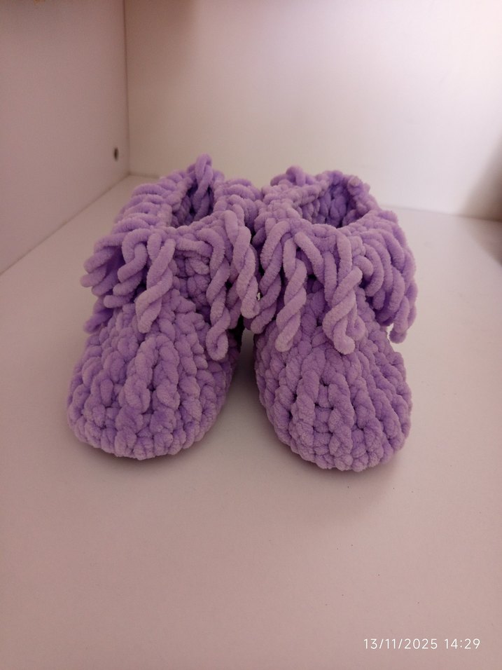 Mor renkli, örgü kız çocuk pandufları sıcak ve rahat, sade tasarımlı, küçük ayakları korur.