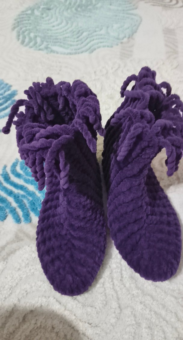 Mor renkte, yumuşak iplikten örülmüş kız çocuk terlikleri, püskül detaylarıyla bohem tarz sunar.
