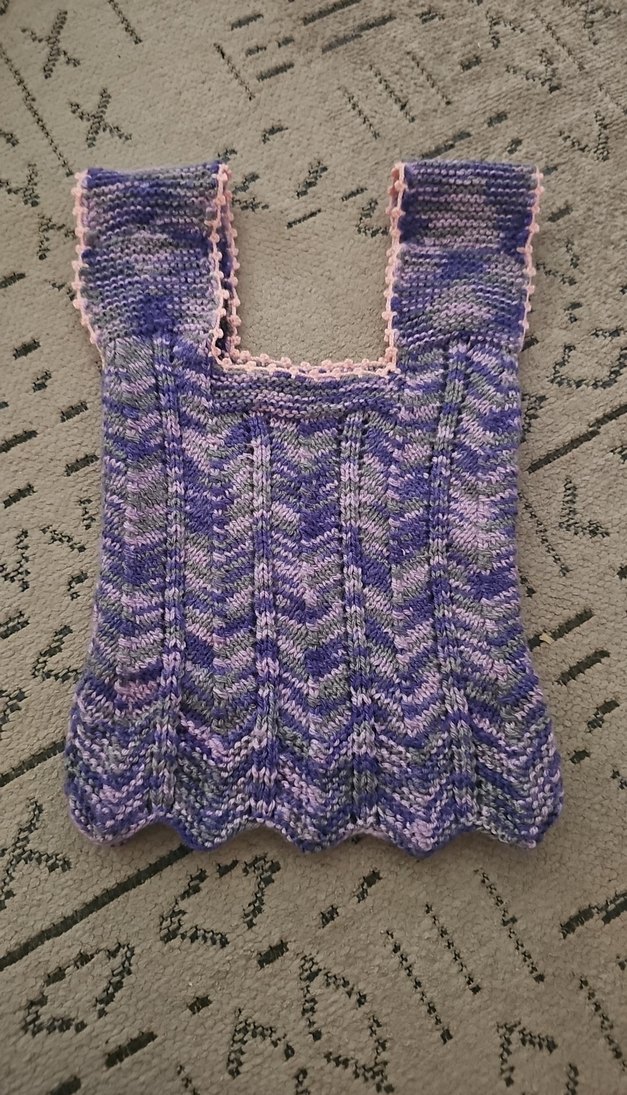 Mor ve gri tonlarında örgüden yapılmış, kolsuz, kayık yaka ve vücuda oturan bohem tarzda kız çocuk süveteri.