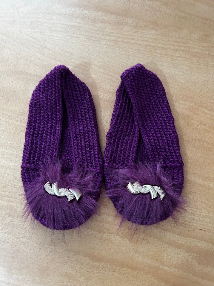 Mor renkli, örgü kız çocuk terlikleri, ön kısmında yumuşak tüy ve dekoratif detay içerir.