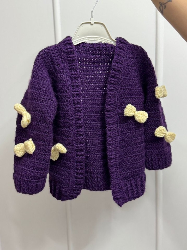Mor renkli, uzun kollu, bol kesim kız çocuk örgü hırka. Kollarında sarı fiyonk detayları bulunan renkli ve rahat bir modeldir.
