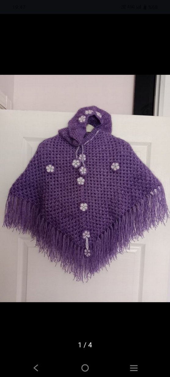 Mor renk, şapka ve uzun kız pançosu. Örgü ipi yapılmış, renkli nakışlarla süslenmiş ve püskül detaylarına sahip.