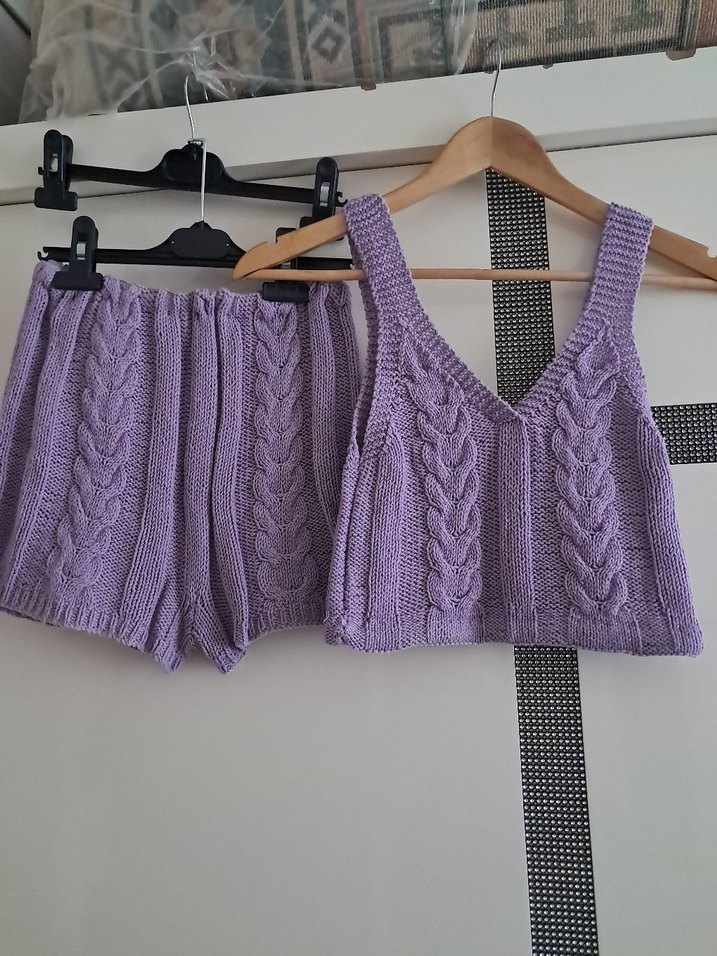 Mor renkli, örgü kumaştan yapılmış, salaş kesim süveter ve şort takımı. Askılı süveter ve rahat şort, bohem tarzı için uygun.
