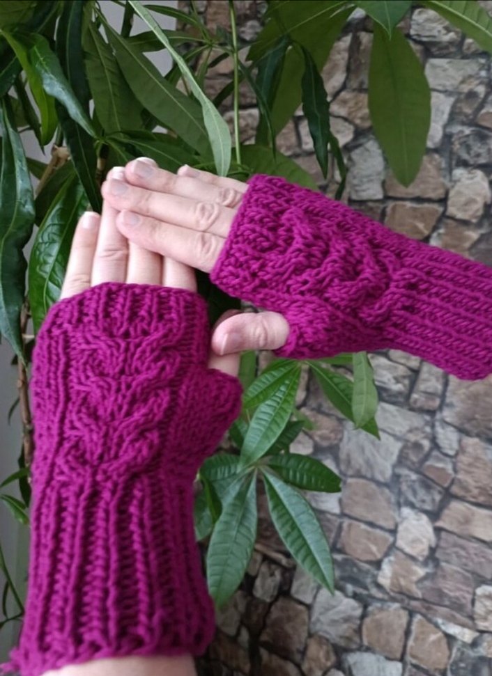 Mor renkli, örgü parmakları açık kadın eldivenleri, rahat ve bohem tarzıyla renkli ve retro bir görünüm sunar.