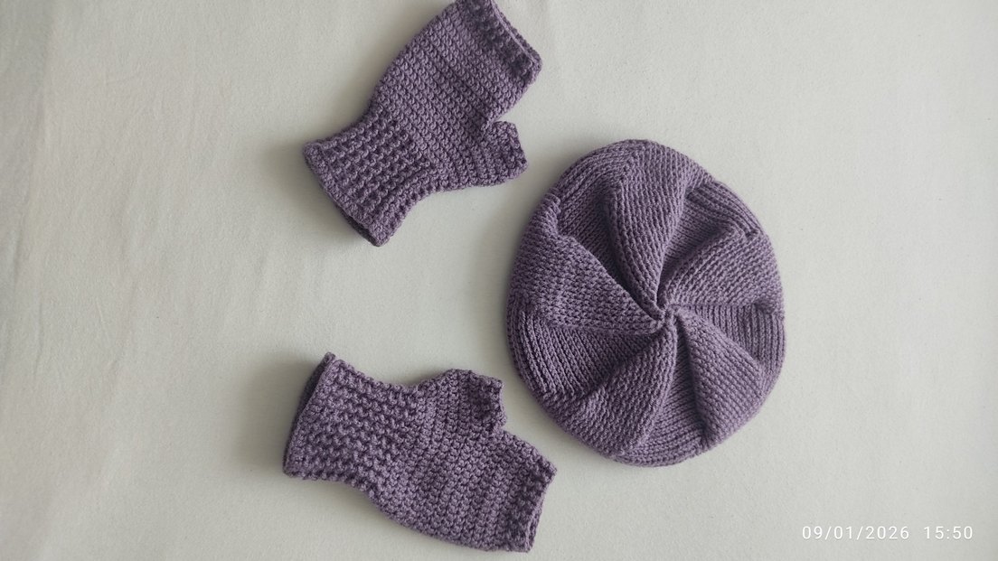 Mor Örgü Parmaksız Kadın Eldiveni ve şapkası