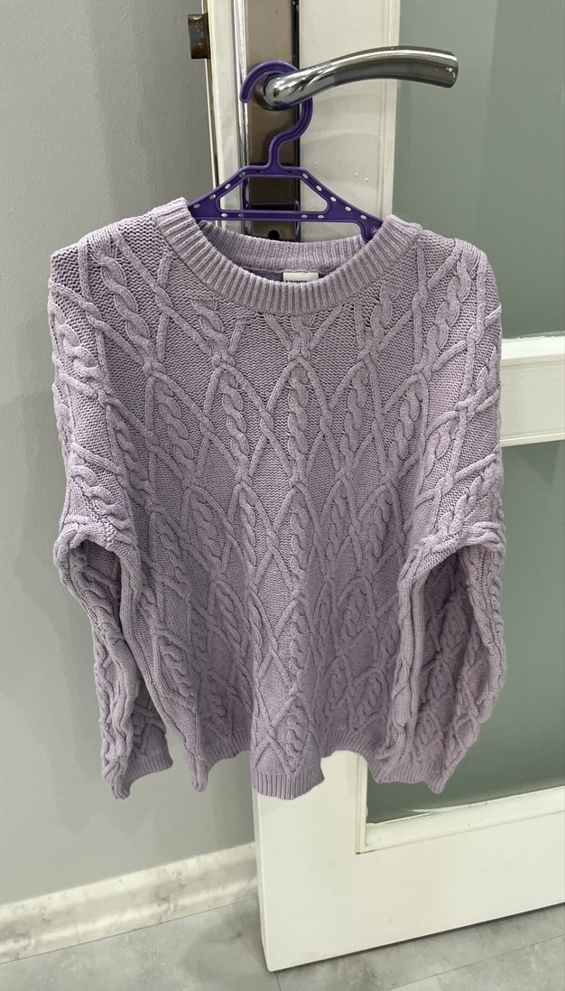 Mor renkli, örgü dokulu, uzun kollu, yuvarlak yakalı, bol kesim triko kazak. Normal midi boyda, günlük kullanıma uygun sade tasarım.