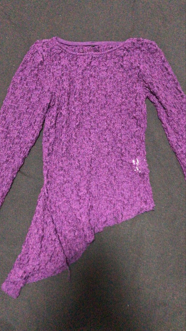 Bu koyu mor örgü kazak, uzun kollu ve bisiklet yaka olup, vücuda oturan midi uzunluğunda asimetrik kesimlidir. Günlük kullanım için rahat ve avangart gotik tarz sunar.
