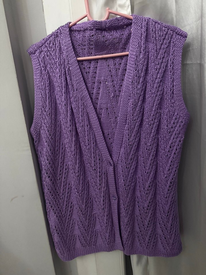 Mor renk, V yaka, kolsuz ve örgü dokulu kadın yeleği. Bohem tarzda, midi boy ve rahat kesim, günlük kullanıma uygundur.