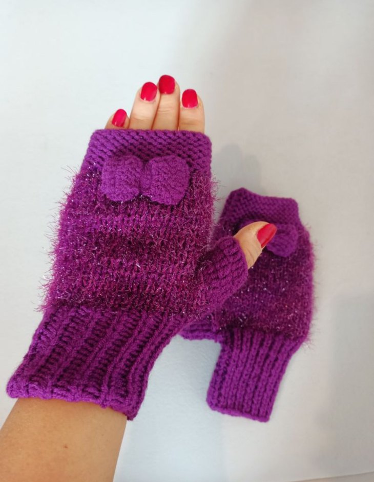 Mor örgü yarım parmak eldiven, rahat dokusu ve süslü fiyonk detayıyla bohem ve retro tarzına uygun.