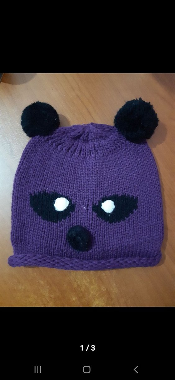 Mor renkte, siyah göz ve burun detaylarına sahip, iki siyah ponponlu örme çocuk beresi. Goth tarzını yansıtır.
