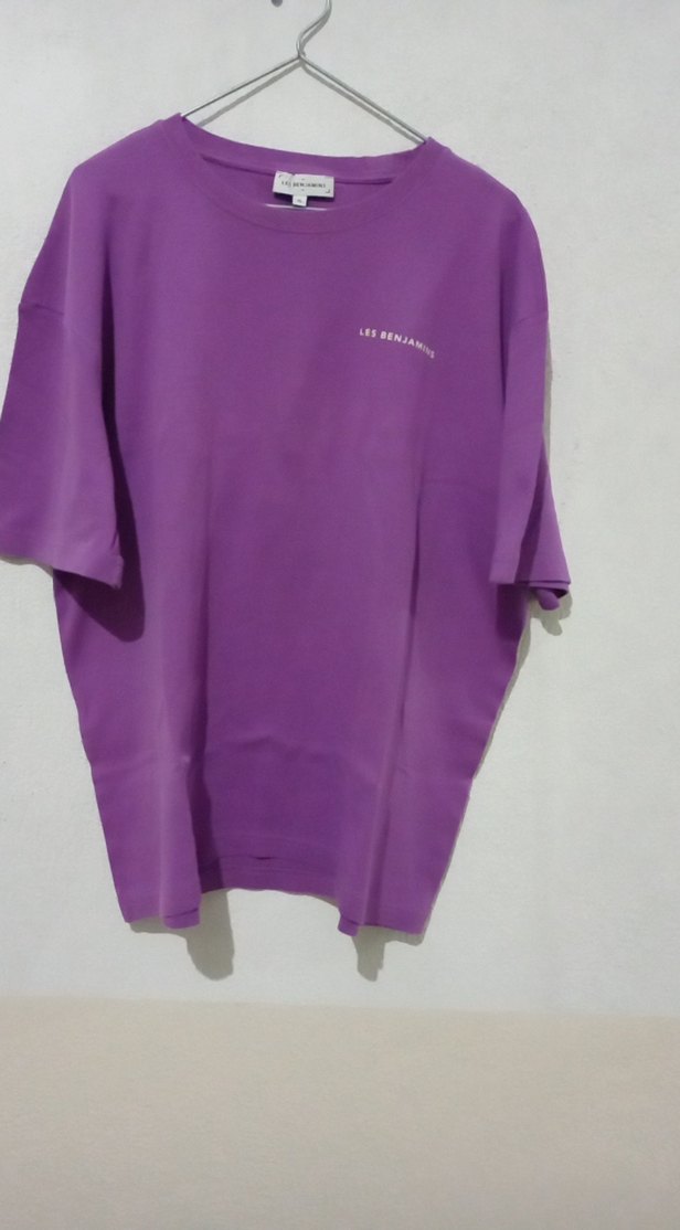 Mor renkli, kısa kollu, oversize kesim erkek tişört. Sentetik kumaştan üretilmiş, baskılı desenli ve günlük kullanıma uygun rahat bir model.