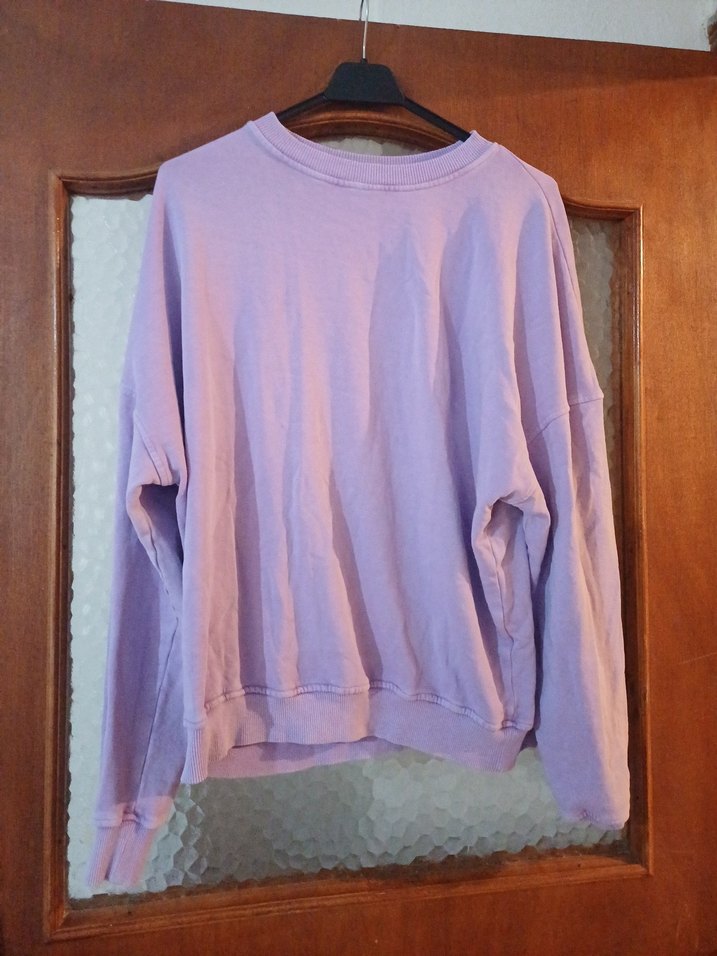 Mor renkli, yuvarlak yaka ve uzun kollu kadın sweatshirtü. Bol kesimli ve keten kumaştan, rahat ve günlük kullanıma uygun.