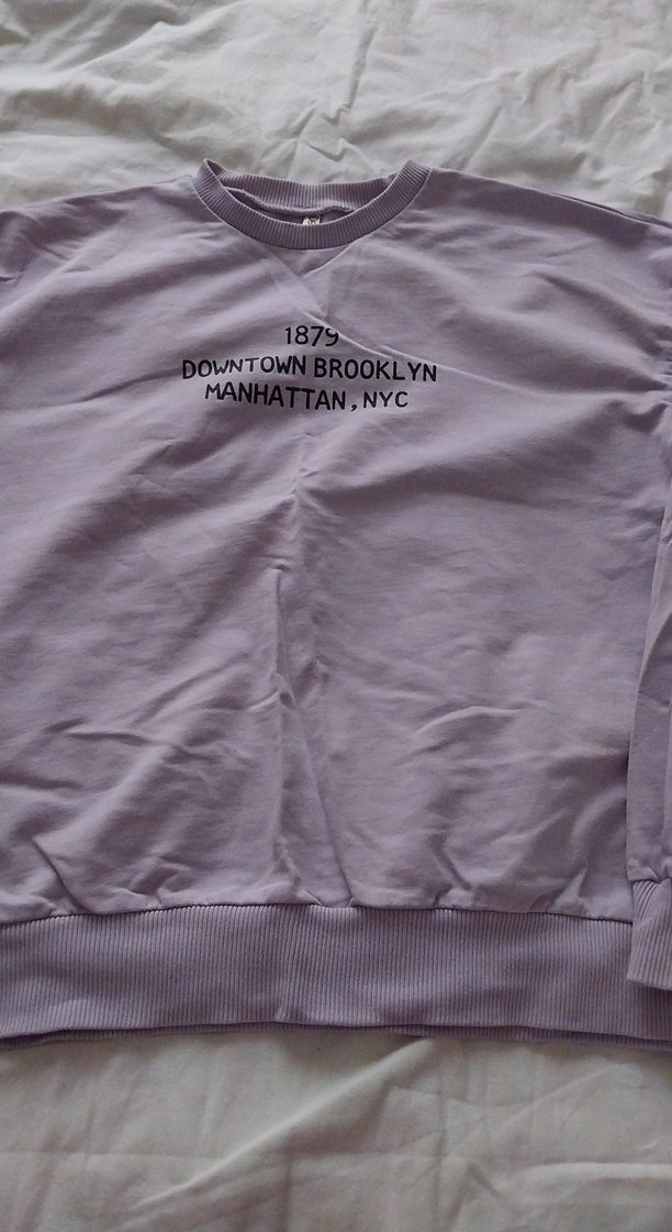Pastel mor renkte, pamuklu kumaştan, yuvarlak yaka ve uzun kollu, bol kesim, normal midi boy baskılı kız çocuk sweatshirt. Rahat ve şık bir sokak stili için ideal.