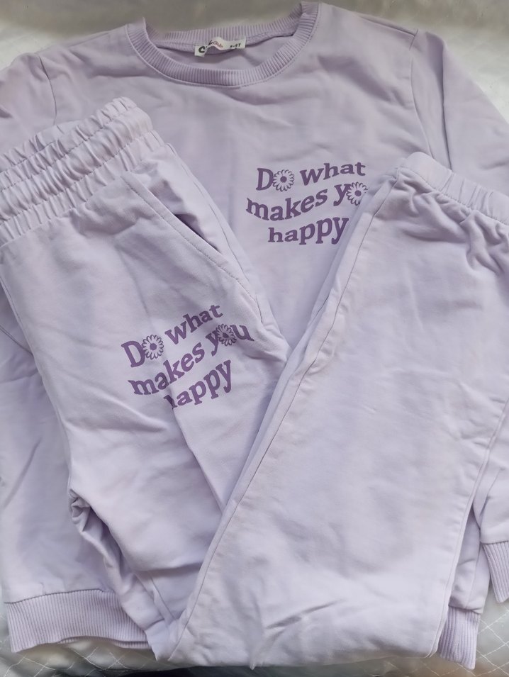 Mor pamuklu kumaştan, baskılı ve rahat kesim kız eşofman takımı. Bisiklet yaka ve uzun kolludur, gündelik ve şık bir tarz sunar. Son resimde belirttiğim gibi bacak kısmında lekesi var