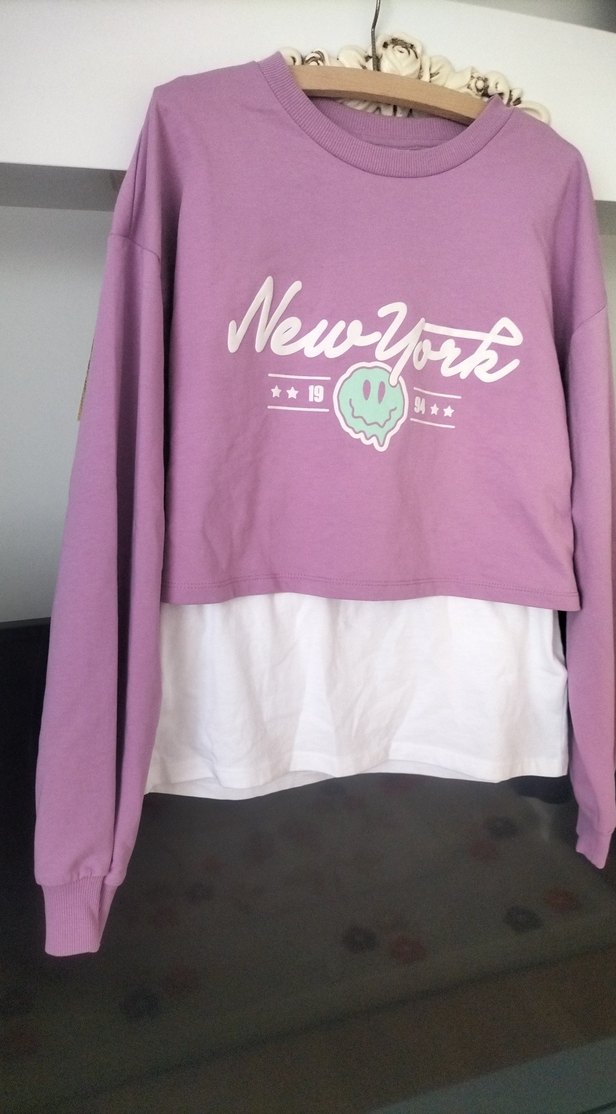 kızıma lcw den aldık giyemedi sevemedi. yepyeni duruyor. Pamuklu, uzun kollu, yuvarlak yaka, salaş kesim mor sweatshirt. "New York" baskılı ve beyaz katmanlı detaylıdır.