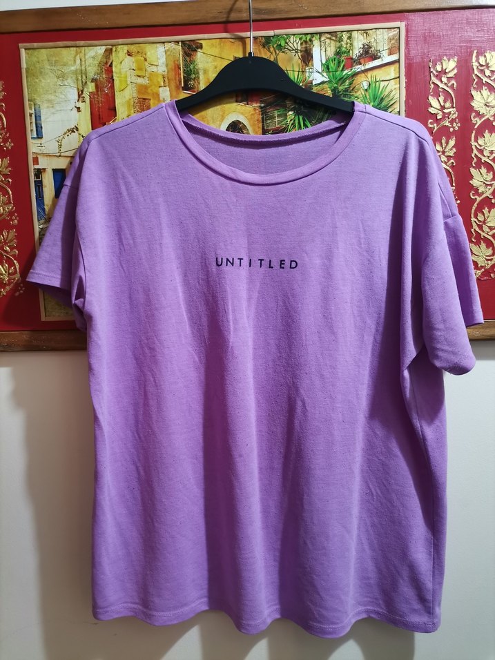 Mor pamuklu tişört, kısa kollu ve yuvarlak yaka. Rahat kesim ve baskılı