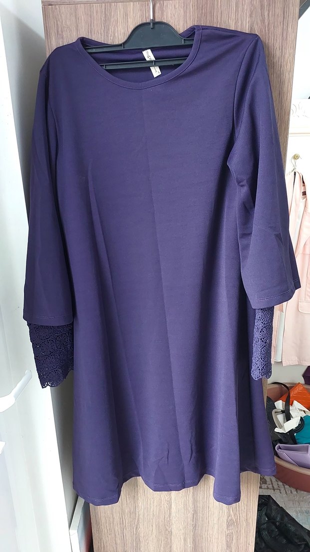 Mor renkte, pamuklu kumaştan salaş kesim uzun kollu ve bisiklet yaka midi tunik. Kollarında dantel detayları vardır, günlük kullanım için uygundur.