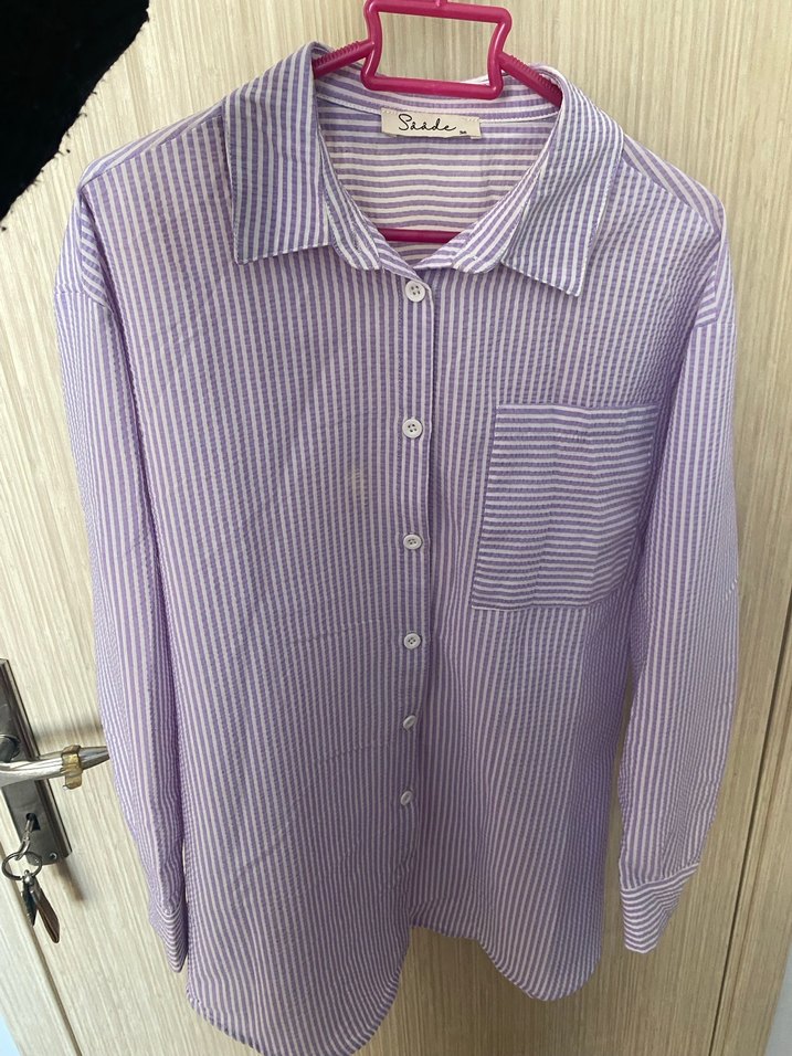 Mor pastel renkte, uzun kollu, düğmeli ve yakalı pamuklu gömlek. Rahat kesimli, tek göğüs cebine sahip günlük sokak stili gömlek.