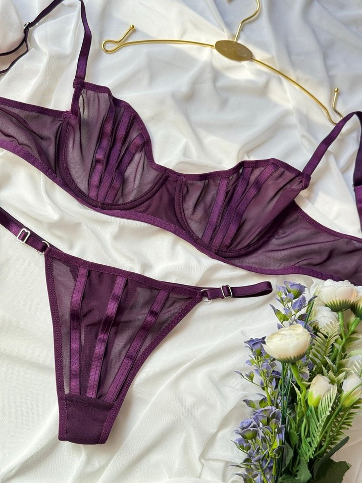 Mor renkli, Parisian tarzı midi uzunluğunda sütyen ve tanga seti. Şeffaf kumaş ve çizgili detaylarla modern bir görünüm sunar. Ayarlanabilir askılı.Tüm bedenler mevcuttur.S/M/L/XL