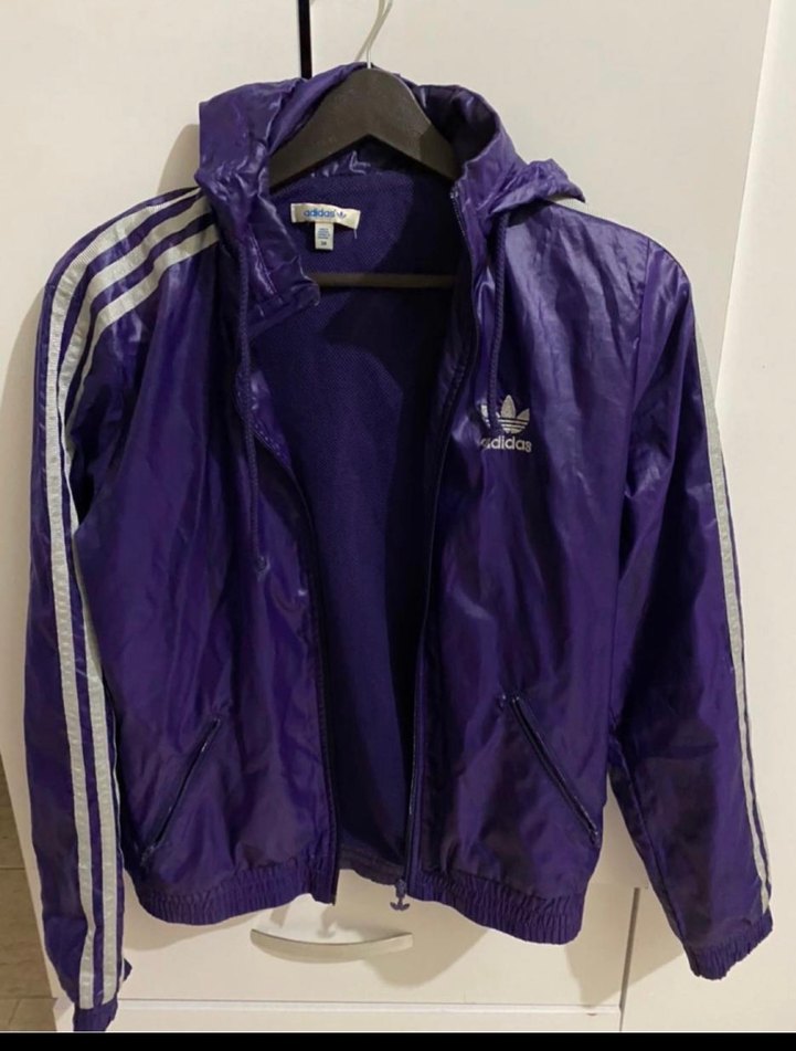 Mor parlak sentetik kumaştan, uzun kollu ve yüksek yakalı, fermuarlı Adidas spor ceket. Dış mekan için şık ve rahat bir parça.