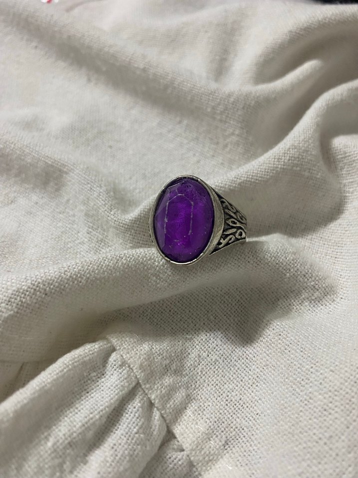 Parlak mor taşlı, detaylı gümüş bantlı erkek yüzüğü, bohem ve retro tarzı yansıtıyor.