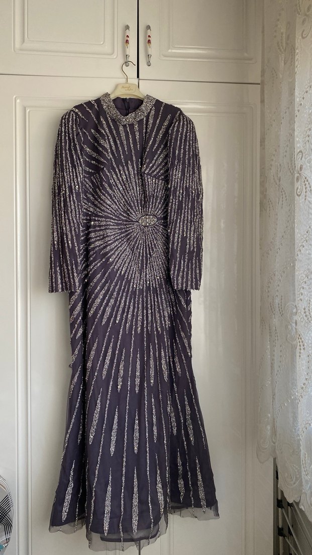 Bu mor parlak desenli uzun abiye elbise, yakalı ve uzun kollu olup, drapeli klasik kesime sahiptir. Düğünler için uygundur.