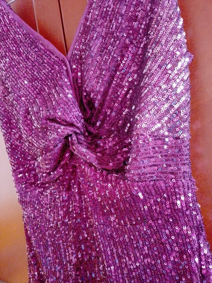 V yaka ve ince askılı, drapeli tasarıma sahip mor parlak uzun abiye elbise. Nakış işlemeli ve vücuda oturan kesimiyle göz alıcı bir görünüm sunar. ✨