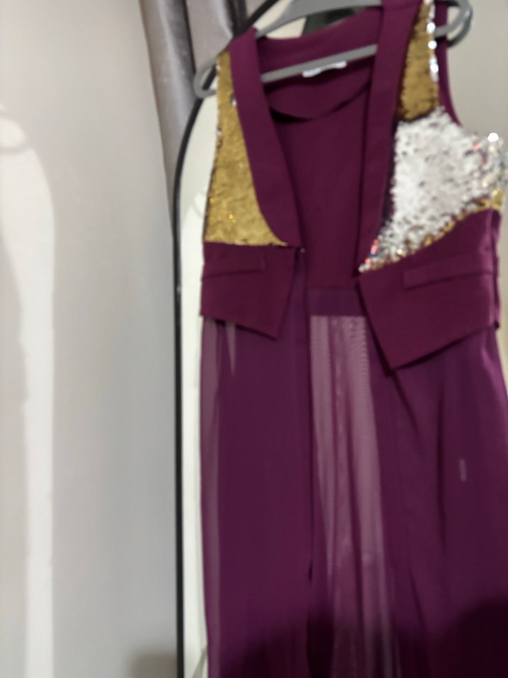 Bu dar kesim uzun abiye elbise, kolsuz ve V yakalıdır. Mor parlak renk ve altın-gümüş baskılı detaylarla avant-garde parti tarzına uygundur. ✨