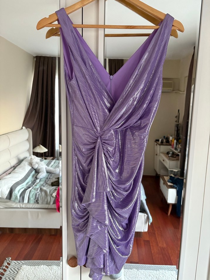 Mor Parlak Drapeli V Yaka Midi Elbise 36/38