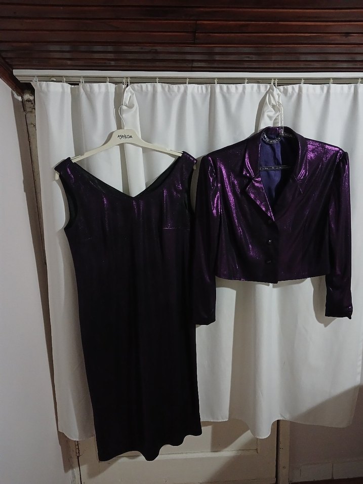Koyu mor,i kadın elbisesi ile uzun kollu ceket, parlak ve ipeksi kumaştan. Gotik ve avangart parti tarzları için uygun. ✨