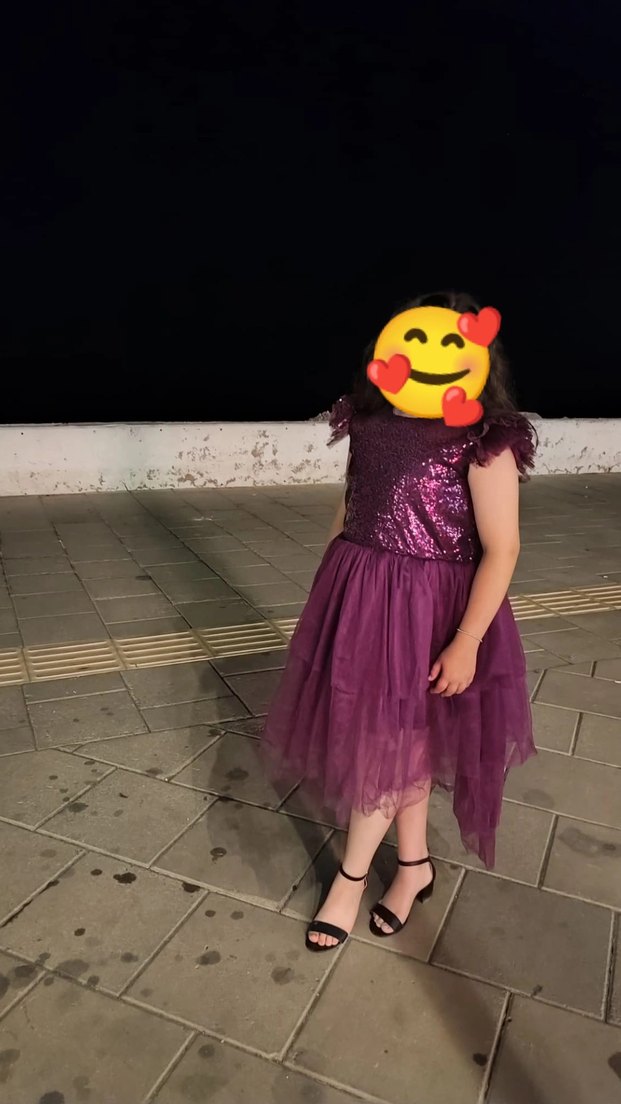 Parlak detaylı, straplez ve askılı kollarıyla mor gotik tarzda, vücuda oturan kız çocuk elbisesi. ✨1 kere giyindi