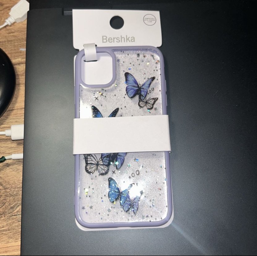 Mor renkli Bershka telefon kılıfı, parlak kelebek desenleri ve bohem tarzıyla dikkat çekiyor. Telefonunuza hafif ve ışıltılı bir görünüm katıyor. Sıfır