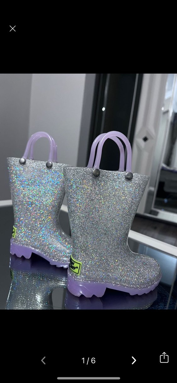 Mor renkli, parlak simli plastik kız çocuk yağmur çizmesi, taşıma kulpları ve renkli dikkat çekici tasarıma sahip. Işıklı. Western chief marka