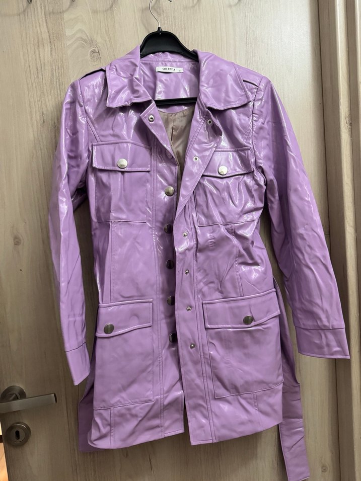 Parlak mor deri kadın ceket, normal uzunlukta ve regular fit. Düğmeli cepleri, strappy kollu ve yakası notched lapel tarzında, sokak modasına uygun.