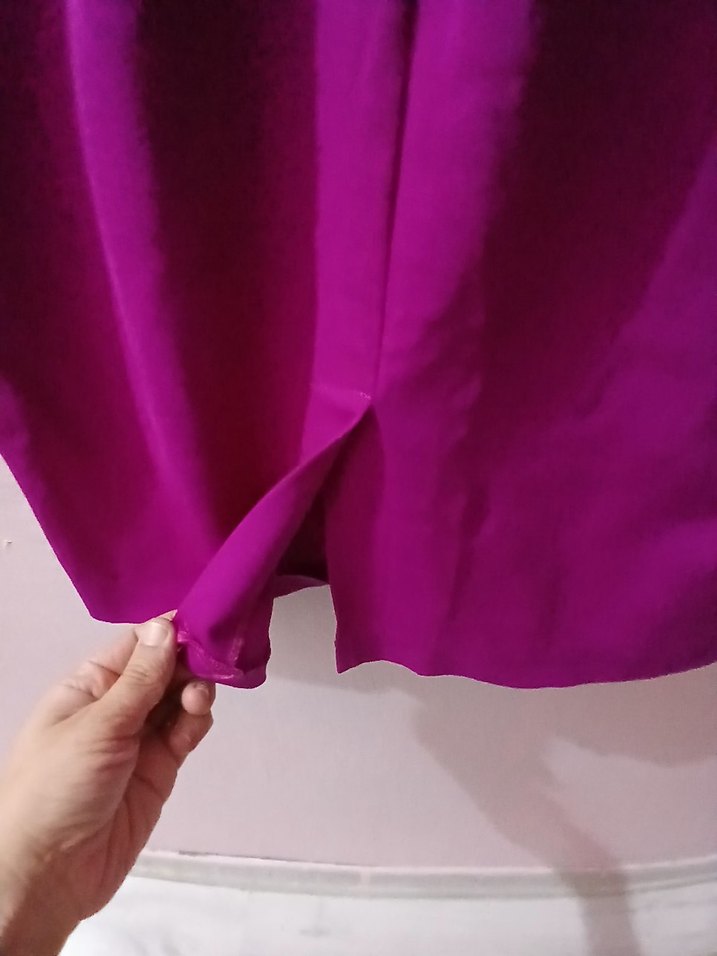 Parlak mor, ipeksi kumaştan, drapeli ve vücuda oturan mini yirtmacli elbise minimalist ve şık bir duruş sunar, düğünler için özel gunler uygundur.