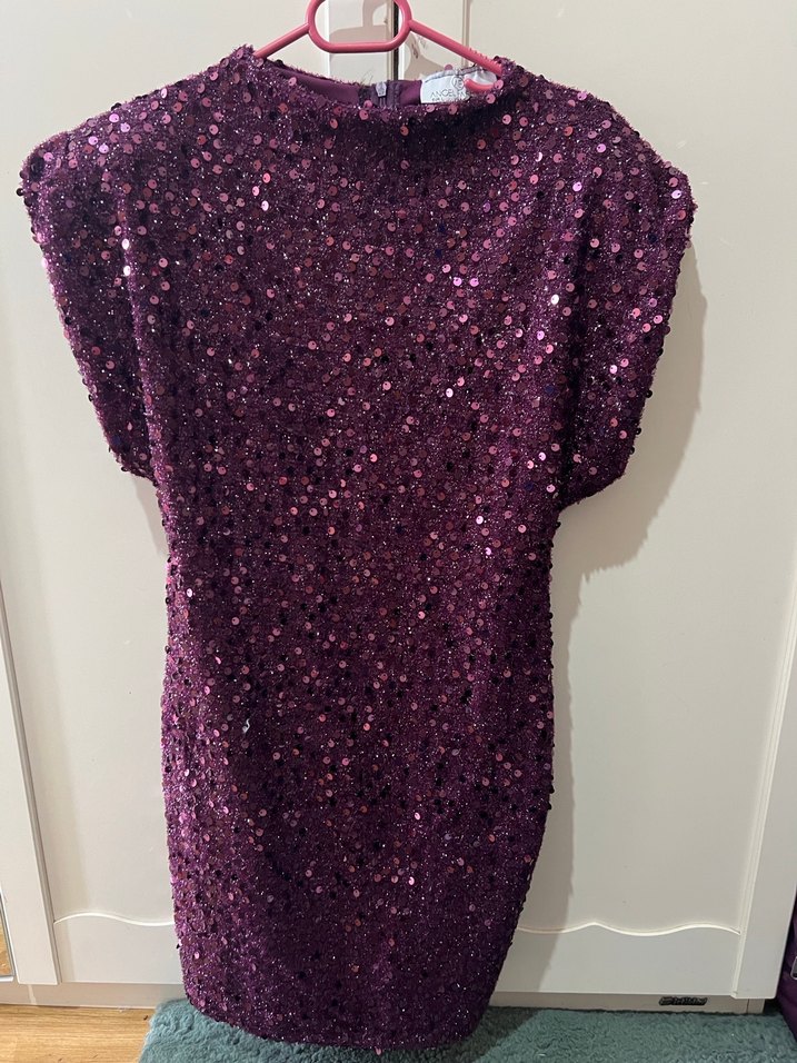 Mor parıltılı, kısa kollu ve bisiklet yaka, midi boyda, desenli ve vücuda oturan kadın abiye elbise. ✨