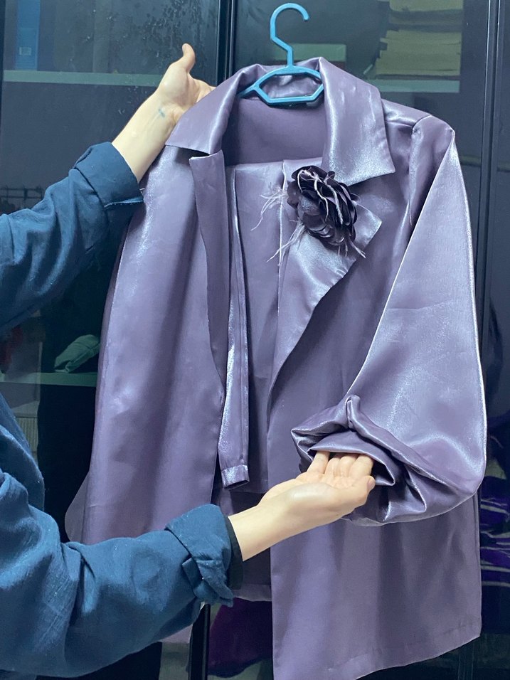 Mor parlak midi tunik takım saten görünümlü kumaştan, uzun kollu, regular fit, Paris sokak stili ve Özel gün için uygun hiç giyilmedi pantolonu havuç kesimdir