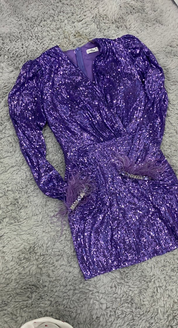Parlak işlemeli ve tüy detaylı, uzun kollu, V yaka, mor renkli mini abiye elbise, şık partiler için ideal. ✨