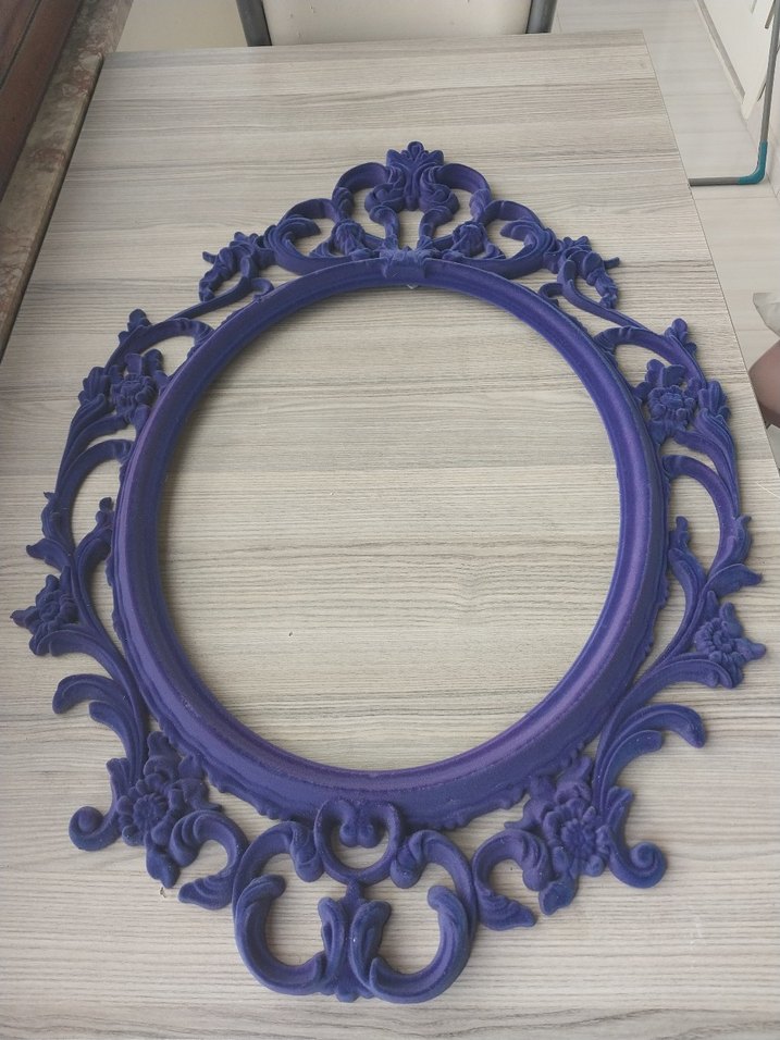 Boyu 84 cm.eni 58 cm.Parlak mor oval ayna çerçevesi, detaylı dekoratif desenlerle vintage bir hava katar.Kadifemsi dış yüzeyi var.Bir kaç yerinde ufak tefek açılma var.Arka kısmında aynayı tutan iki tane tutacın ucu kırık.Ama ayna takılmasına engel değil.