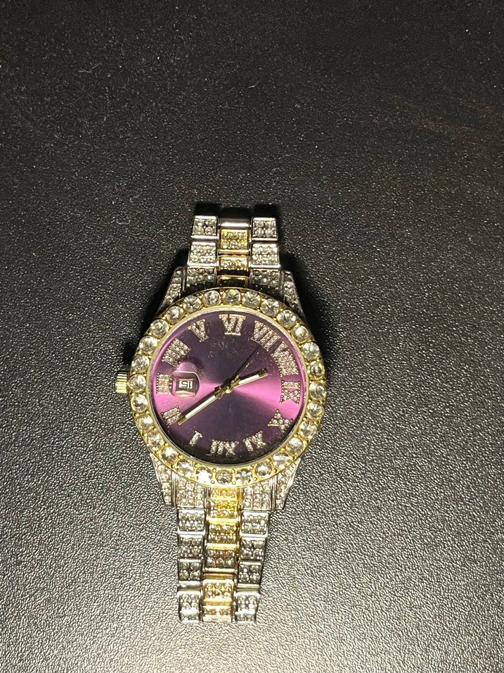 Mor parlak kadran ve payet detaylı, metal kayışlı erkek saati. Glamoröz ve street wear tarzını yansıtıyor. ⌚