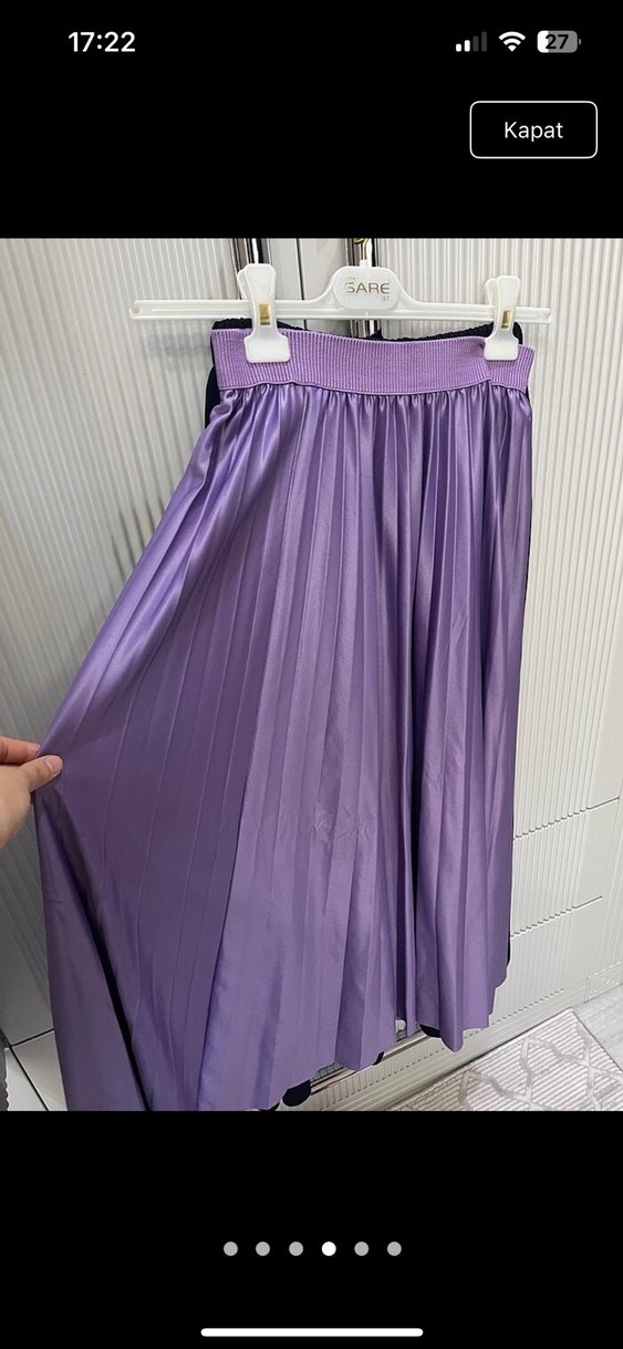 Parlak, ipeksi kumaştan yapılmış, pilili ve bol kesim mor uzun etek. SARE markalı, şık bir düğün kombini için uygundur.