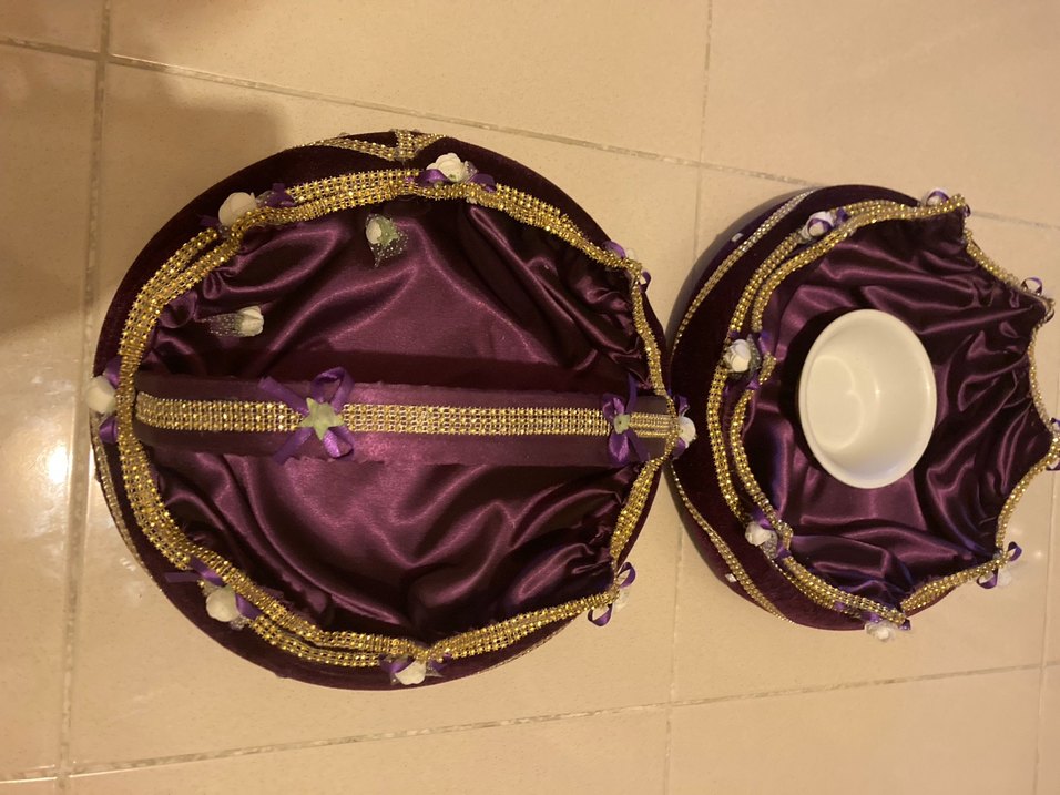 Parlak mor renkli, küçük çiçekler ve altın süslemelerle dekore edilmiş şık sepet ve saklama çantası.