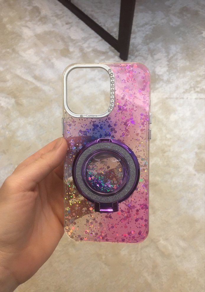 Pastel mor renkte, simli ve pop kültür tarzında halka tutuculu telefon kılıfı. ✨16.promax için uygundur ayakta durabiliyor
