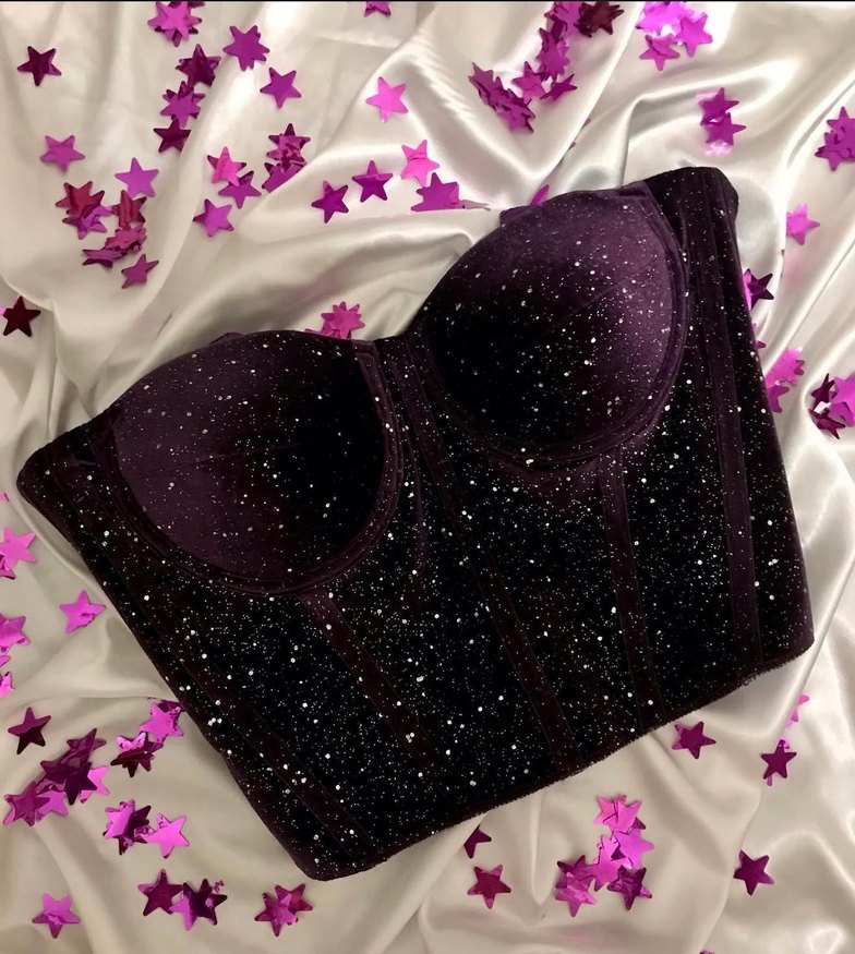 Mor, parlak parıltılı detaylı galaksi büstiyer 1 kere giydim arkası iplidir çok güzel