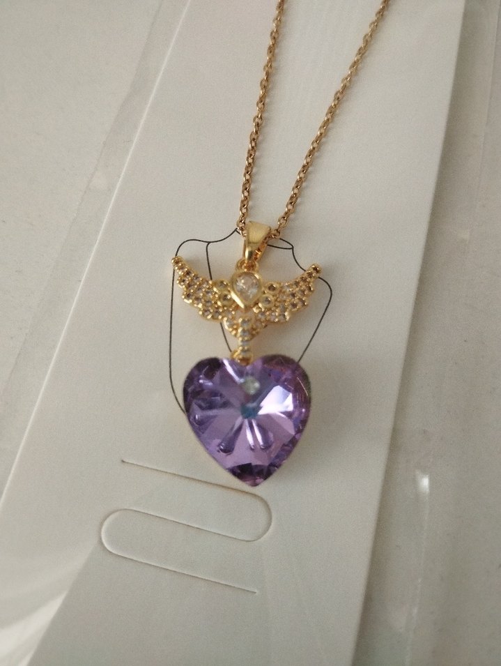 Şık tarzda, zincir detaylı mor kalp kolye ucu içeren, günlük kullanıma uygun renkli ışıldayan taşlı kolye, hiç kullanılnadı, ambalajında duruyor, hediye olarak da düşünebilirsiniz