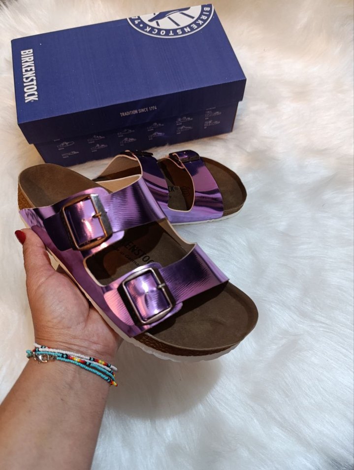 Mor parlak tokalı kaydırmaz tabanlı kadın terlik, dolgu topuklu ve rahat kauçuk malzemeden üretilmiştir. Günlük sokak stiline uygundur. Birkenstock marka.