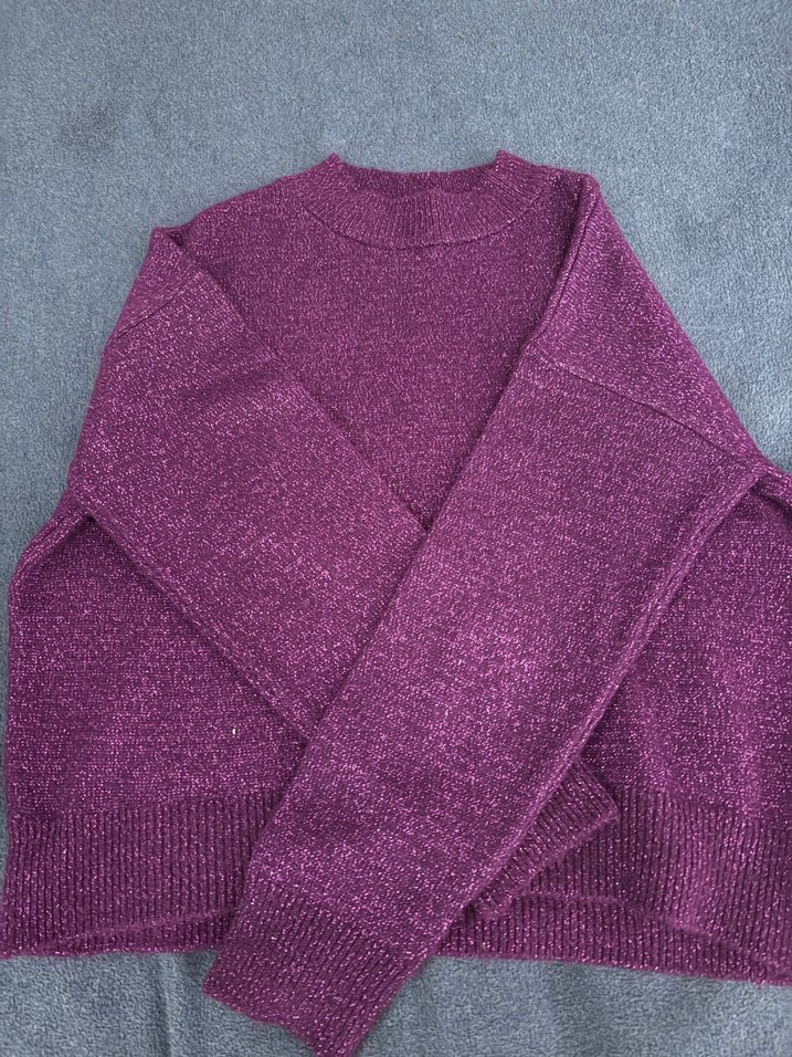 Mor renkli, parlak triko kumaştan örülmüş, yuvarlak yaka ve uzun kollu kadın kazak. Rahat kesimi ve normal boyu ile günlük kullanım için uygundur.✨1-2 defa kullanıldı yıllar önce almıştım yıllardır dolapta bekliyor sıkıntısız çok kaliteli