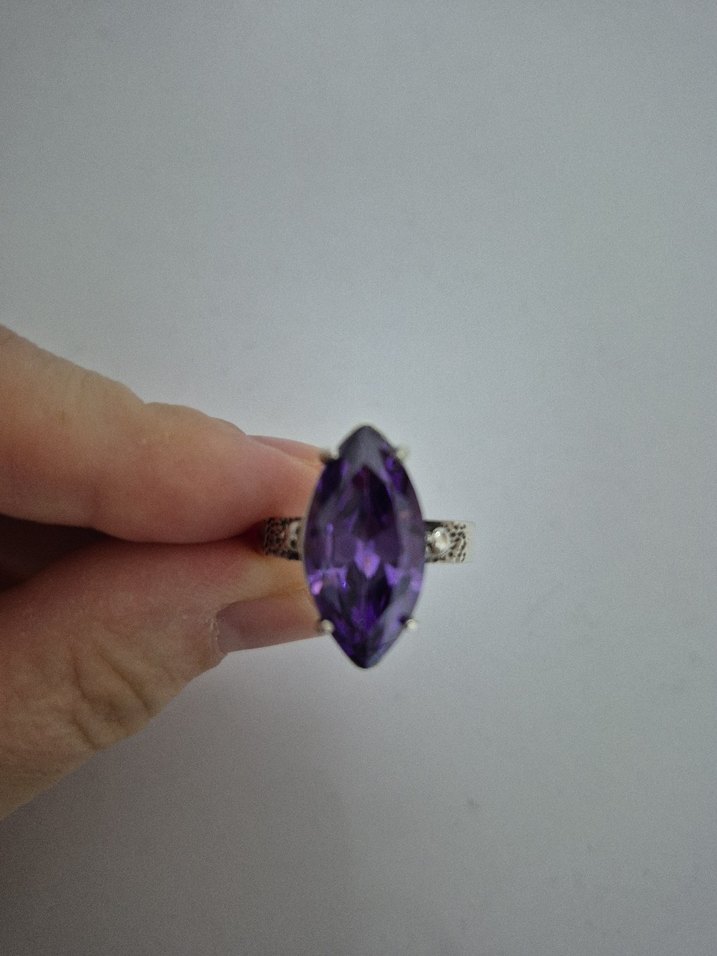 Parlak mor payetli taşlı vintage tarzı kadın yüzük, romantik akşamlar için uygun. El işçilikli