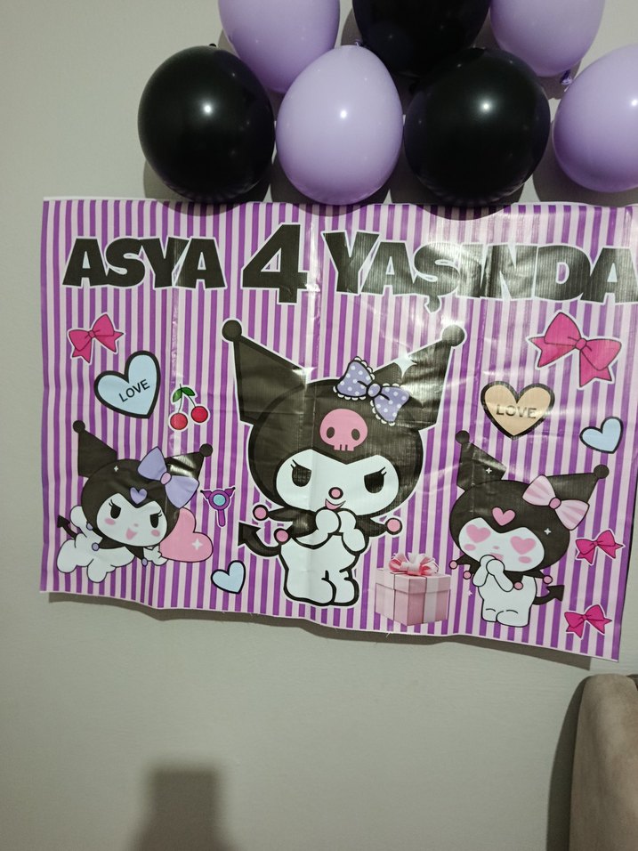 Mor renkli, kalpler ve fiyonklarla süslenmiş, 'ASYA 4 YAŞINDA' yazılı parti afişi, doğum günü kutlaması için uygun .